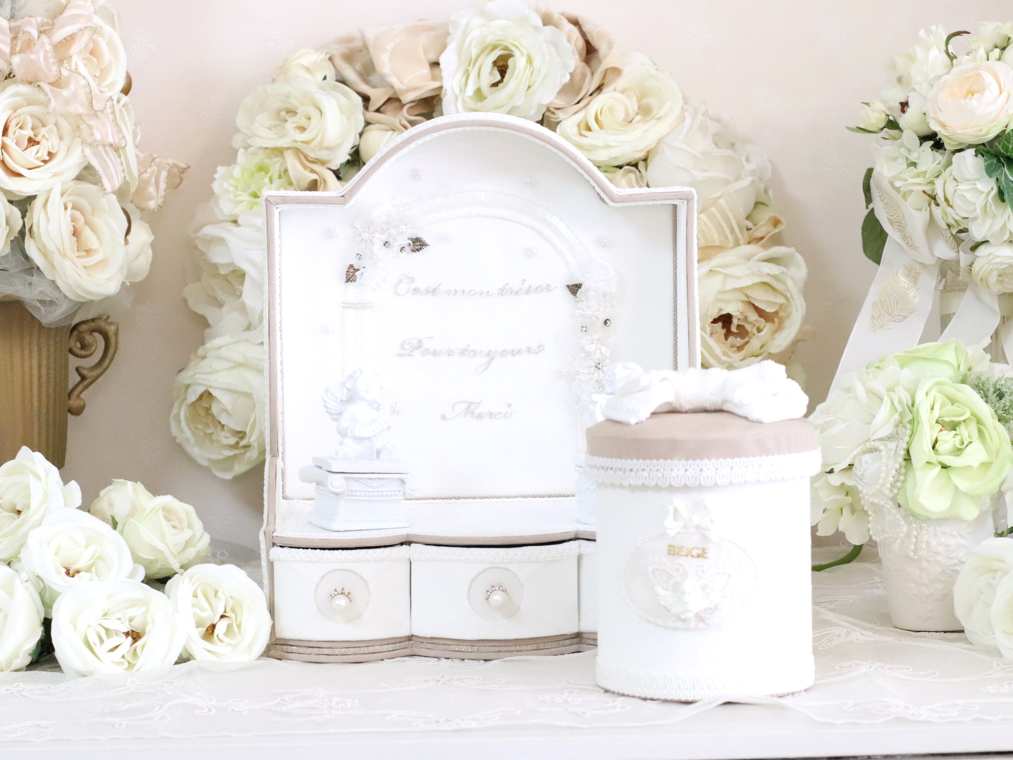 使用するのは、主にフランス製の高級ファブリックやリボンなどの洗練された素材。 これまでの「お仏壇」や「骨壺」のイメージとは違う、お部屋にそっと溶け込みながらも、まるでアート作品のような佇まいに。 “あの子との日々を、美しく飾る” Mémoire de Beigeが目指すのは、そんな祈りのかたちです。